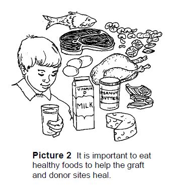 - It is important for your child to eat healthy foods to help the graft site and donor site heal and to decrease the chance of developing an infection. Just as before surgery, your child should eat foods high in protein