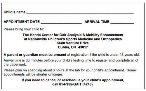 If you have any questions about the test, call the Honda Center for Gait Analysis & Mobility Enhancement at 614-355-GAIT (4248).