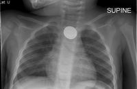 The key to differentiating a button battery from a coin is to magnify or zoom into the image looking for a double ring or halo. This x-ray shows a small ridge on the object that this toddler has swallowed – a button battery.